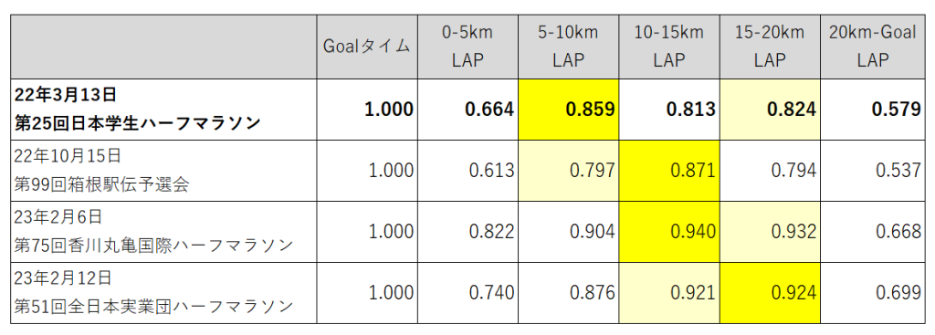 ちなみに、日本学生ハーフよりも箱根駅伝予選会の方が相関係数の最高値区間が少し後ろなのは、箱根駅伝予選会の方が日本学生ハーフよりも最初の周回コースの距離が長いこと、留学生選手が多く集団が縦長になりやすいことも影響していると思われます。