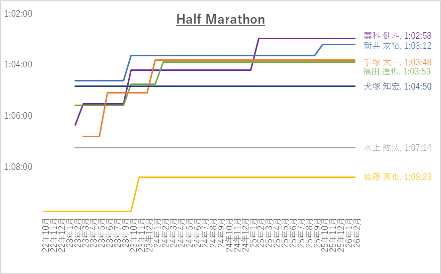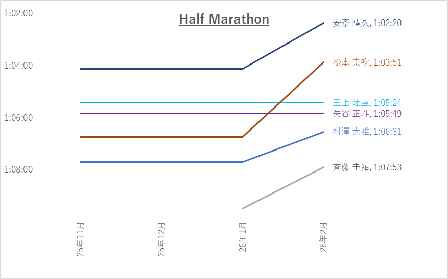 来年度新チームのハーフマラソン上位10名平均は1:02:22です。62分切り3名、63分切り8名、64分切り11名と躍進しています。
