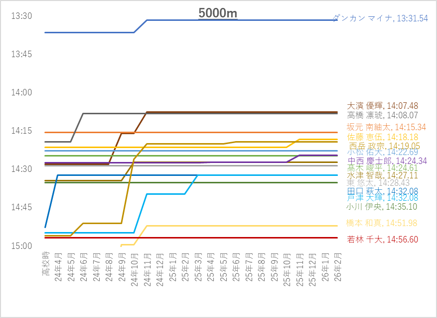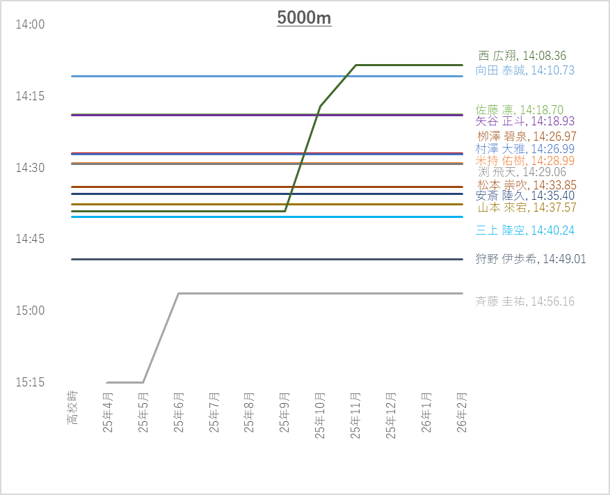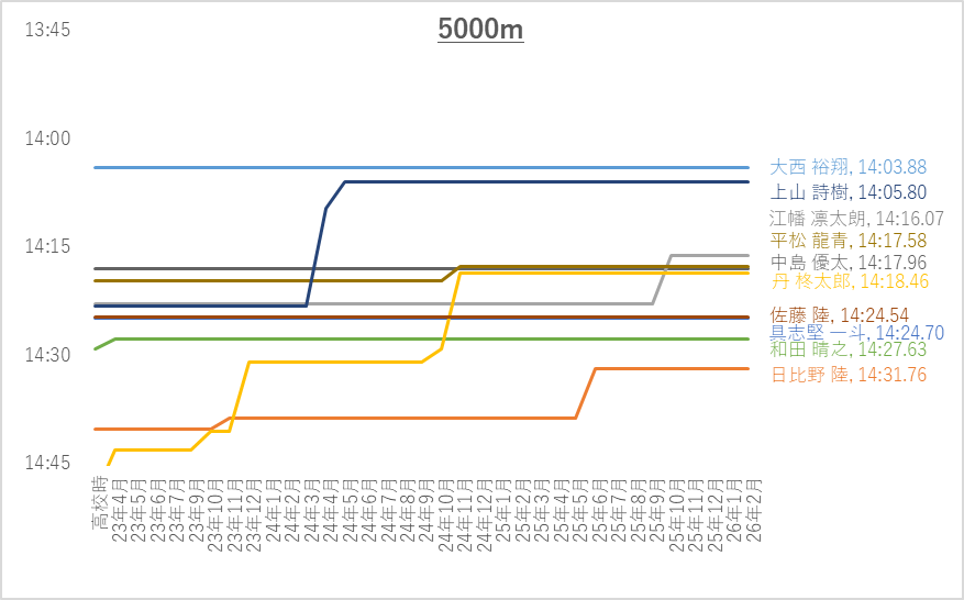 5000m上位10名平均(4年生含む)は14:01.69です。