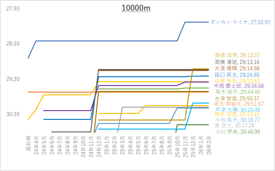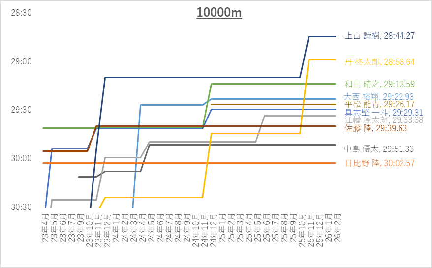 10000mの上位10名平均(4年生含む)は28:53.24です。