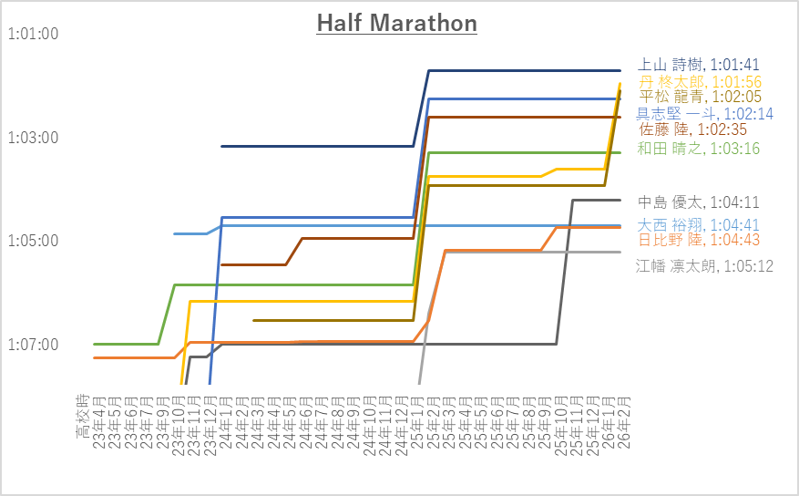 ハーフマラソン(4年生含む)の上位10名平均は1:02:21です。